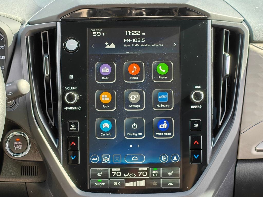 - Radio: Subaru 11.6" Multimedia Plus System -inc: valet mode, integrated center information display, AM/FM stereo HD Radio, multi-touch gesture high resolution display screen, voice activated controls, Bluetooth® audio streaming and hands-free phone connectivity w/SMS text messaging (refer to Subaru.com for cellphone compatibility), iPod control capability, smartphone integration: Android Auto and Apple CarPlay w/full screen view and wireless connection, USB and Over The Air (OTA) audio system update, steering wheel controls, 6 speakers, 3.5mm auxiliary input jack and roof mounted audio and satellite antenna