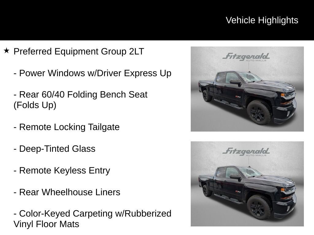 2017 Black Chevrolet Silverado 1500 6-Speed Automatic Electronic with Overdrive 6-Speed Automatic Electronic with Overdrive, 4WD, Black Cloth, 110-Volt AC Power Outlet, 150 Amp Alternator, 4.2 Diagonal Color Display Driver Info Center, 6 Speaker Audio System, All Star Edition, Black Door Handles, Black Painted Mirror Caps, Bluetooth® For Phone, Body Color Bodyside Moldings, Body Color Rear Bumper w/Cornersteps, Body-Color Door Handles, Body-Color Grille Surround, Body-Color Headlamp Bezels, Body-Color Mirror Caps, Body-Color Power Adjustable Heated Outside Mirrors, Color-Keyed Carpeting w/Rubberized Vinyl Floor Mats, Deep-Tinted Glass, Driver & Front Passenger Illuminated Vanity Mirrors, Dual-Zone Automatic Climate Control, Electric Rear-Window Defogger, EZ Lift & Lower Tailgate, Front & Rear Black Bow Tie, Front Body-Color Bumper, Front Chrome Bumper, Front Frame-Mounted Black Recovery Hooks, HD Radio, Heavy-Duty Rear Locking Differential, Hill Descent Control, Leather Wrapped Steering Wheel w/Cruise Controls, LT Plus Package, Manual Tilt Wheel Steering Column, Midnight Edition, Off-Road Suspension Package, OnStar 3 Months Guidance Plan, OnStar w/4G LTE, Power Adjustable Pedals, Power Sliding Rear Window w/Defogger, Power Windows w/Driver Express Up, Preferred Equipment Group 2LT, Rear 60/40 Folding Bench Seat (Folds Up), Rear Chrome Bumper, Rear Vision Camera, Rear Wheelhouse Liners, Remote Keyless Entry, Remote Locking Tailgate, Remote Vehicle Starter System, Single Slot CD/MP3 Player, Spray-On Pickup Box Bed Liner, Steering Wheel Audio Controls, Theft Deterrent System (Unauthorized Entry), Thin Profile LED Fog Lamps, Trailering Package, Ultrasonic Rear Park Assist, Universal Home Remote, Wheels: 18 x 8.5 5-Spoke Black Paint Alloy. EcoTec3 5.3L V8 LT You will love our NO HAGGLE, NO HASSLE PRICING here at Fitzgerald Auto Mall. Ask us about our BUYER PROTECTION PLAN, LOANER CAR PROGRAMS, AND FREE Vehicle History Report. Can not find what you want?? NO PROBLEM! We have over 1,000 Pre-Owned vehicles available at WWW.FITZMALL.COM. You can also visit us in person at 114 Baughmans Lane Frederick MD, 21702 or Call Us @240-629-7301.