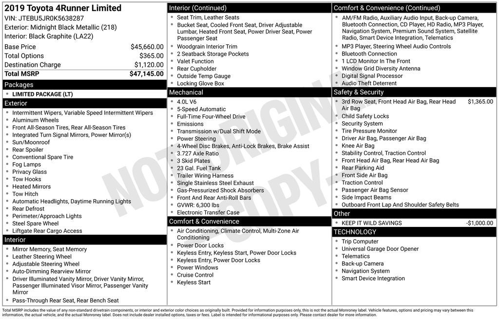 Midnight Black Metallic Limited 4WD 5-Speed Automatic with Overdrive 4.0L V6 SMPI DOHC Back Up Camera, Bluetooth®, Clean History Report, a Clean, One Owner Carfax, 4WD, Black Graphite w/Softex Synthetic Leather Seat Trim, 15 Speakers, 20 x 7.5 Unique Dual 6-Spoke Alloy Wheels, 3.727 Axle Ratio, 4-Wheel Disc Brakes, ABS brakes, AM/FM radio: SiriusXM, Anti-whiplash front head restraints, Automatic temperature control, Brake assist, CD player, Dual front impact airbags, Dual front side impact airbags, Electronic Stability Control, Emergency communication system: Safety Connect, Exterior Parking Camera Rear, Front anti-roll bar, Front Center Armrest, Front dual zone A/C, Front fog lights, Front wheel independent suspension, Garage Door Opener, Heated door mirrors, Heated/Ventilated Front Bucket Seats, Knee airbag, Limited Package, Low tire pressure warning, Moonroof w/Tilt Up & Slide, Navigation System, Occupant sensing airbag, Overhead airbag, Panic alarm, Passenger door bin, Power door mirrors, Power driver seat, Power passenger seat, Radio: Entune Premium JBL Audio w/Navigation, Rear anti-roll bar, Rear window defroster, Rear window wiper, Remote keyless entry, Right & Left Individual Air Conditioner, Security system, Silver Roof Rails, Speed control, Speed-sensing steering, Split folding rear seat, Steering wheel mounted audio controls, Telescoping steering wheel, Tilt steering wheel, Traction control, Variably intermittent wipers.